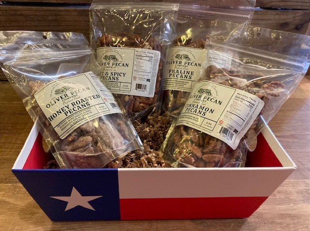 Oliver Pecan Co. Flavored Pecans 11/29/2025 $9.50 Flavored pecans from Oliver Pecan Co. in San Saba, Texas, are a favorite treat! A 6-ounce zip bag will keep them fresh, but we promise, they won’t last long! Choose from a variety of flavors. Flavor Choose an optionPralineHoney RoastedSea Salt RoastedMesquite Roasted BBQCreme BruleeCinnamonHot & SpicyClear Oliver Pecan Co. Flavored Pecans quantity Add to cart SKU: N/A Category: Gourmet Specialties Related products Texas Coffee, Small Packets $3.50 Select options This product has multiple variants. The options may be chosen on the product page Fredericksburg Farms Dip Mix Packets $3.50 Select options This product has multiple variants. The options may be chosen on the product page South Texas Milling Mixes $6.75 Select options This product has multiple variants. The options may be chosen on the product page