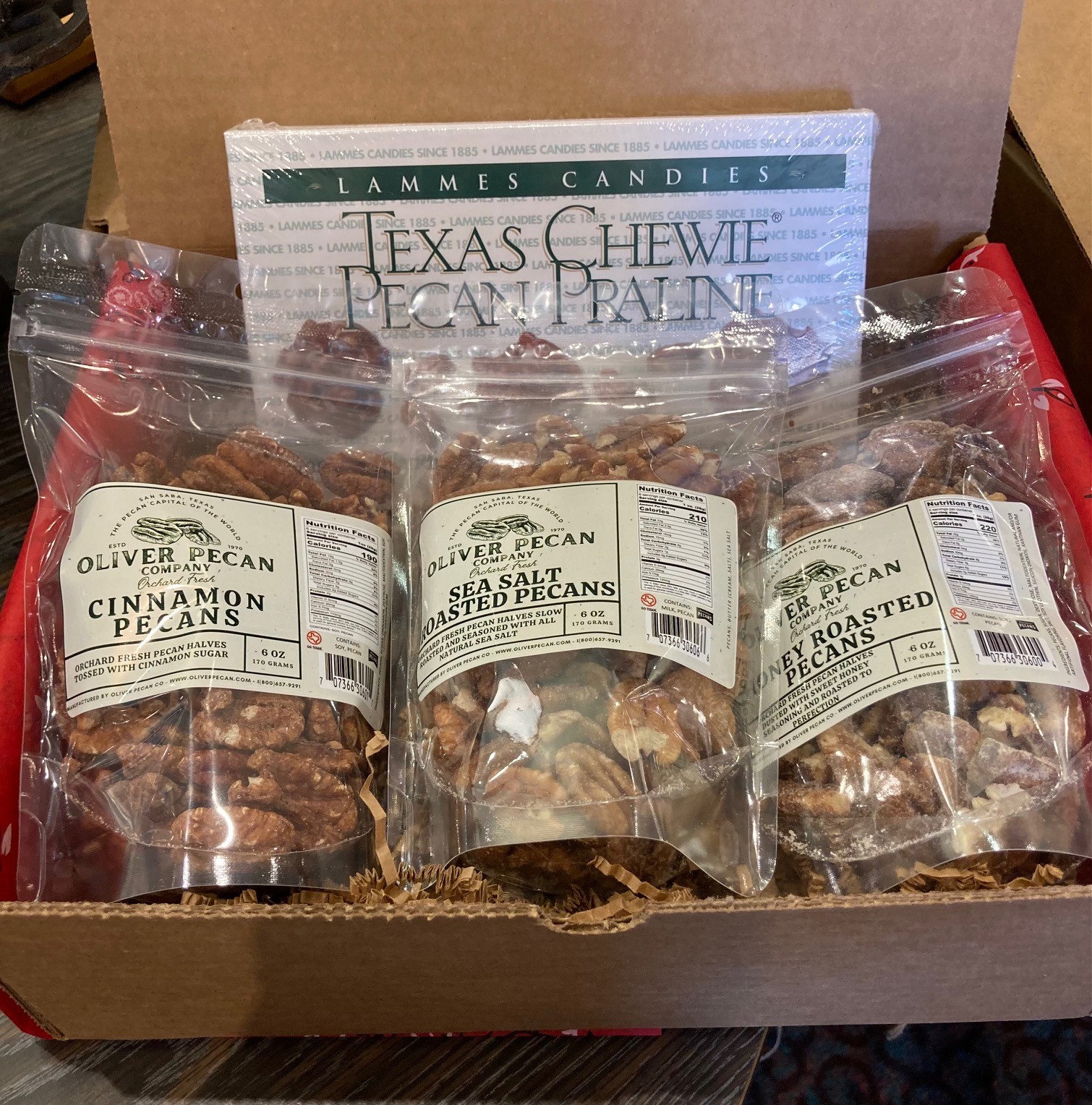 The box includes 3 6-oz. packages of flavored pecans from Oliver Pecan Co. in San Saba, Texas … PLUS a 6 oz. box of Lammes Candies famous Chewie Pecan Pralines.